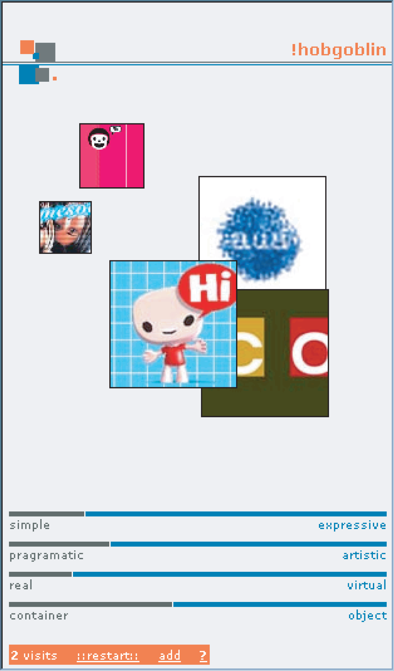 !hobgoblin was, in short, a museum, containing various high quality modern and contemporary artworks, mostly from Scandinavia, that adjusts itself to reflect the decisions, and therefore character, of the user. The works themselves ranged from simple photos of modern designs to contemporary web-based pieces to more mundane service sites that nonetheless reflect quintessential Scandinavian design practices. The museum also included contemporary web-based artworks that may or may not have been produced in Scandinavia but that transcend national boundaries.