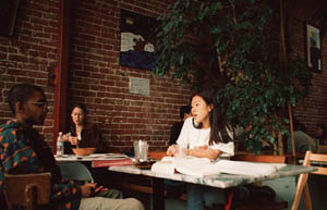 New pattern: Different tables People often want make use of cafes for study sessions, informal meetings or games. They need space to lay out paper projects or other materials. While an individual student can find a place to work nearly anywhere in a cafe, groups need special accomodations. I am a member of a research reading group that meets in a cafe every week to discuss papers and project progress. We have thus far met in two different locations -- Au Coquelet and Berkeley Espresso. In both cafes we were able to find two small tables to push together to form a working space, but it was nonetheless awkward. Starbucks provides a large table towards the back of the cafe, giving small groups a quieter place to spread out papers and work on projects. Also, it is especially helpful to have a bench on at least one side of the table to give people even more space to spread out their materials But some tables are valuable for game playing as well. At several restaurants and cafes, table-tops overlaid with game grids provide a surface for people to play chess or checkers while waiting for a seat or food. In other places it may be appropriate to simply provide a large table space in a secluded section of the cafe with game nearby, in a pouch on the wall, for example. Finally, groups might want to work under different levels of light. An overhead light may be useful if laying out papers or sketching ideas, but if people are working independently and communicating only seldomly, as in study groups, smaller more directed lights may be appropriate. Place small tables with game-board table tops in the waiting area of a cafe or restaurant and larger tables in more secluded areas. Put larger tables near built-in benches and provide adjustable lighting. Smaller, more mobile tables may be more appropriate in busier, more public areas (142) and may be good places to wait for other guests (150). Built-in seats may well complement larger tables (202). |