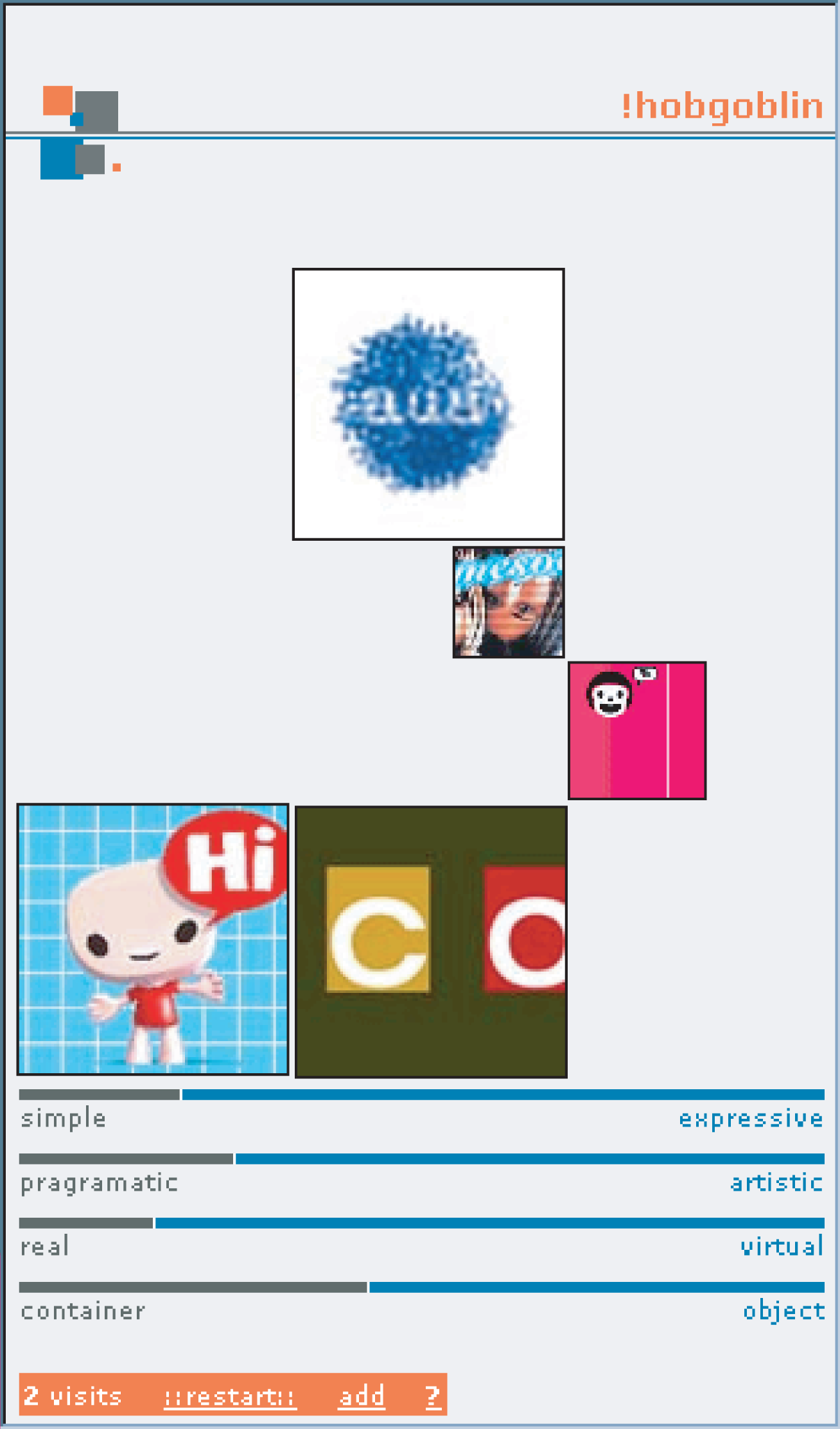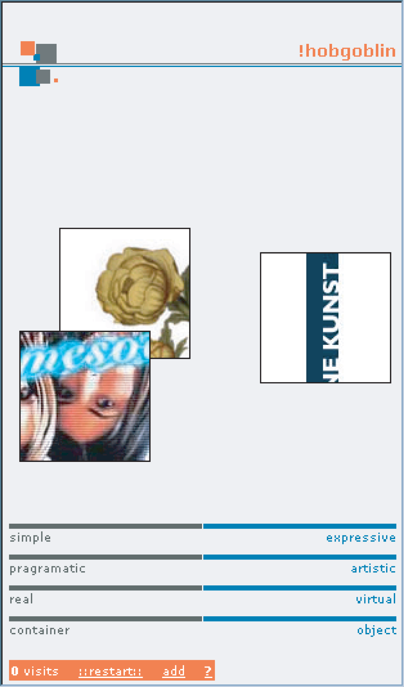 !hobgoblin was, in short, a museum, containing various high quality modern and contemporary artworks, mostly from Scandinavia, that adjusts itself to reflect the decisions, and therefore character, of the user. The works themselves ranged from simple photos of modern designs to contemporary web-based pieces to more mundane service sites that nonetheless reflect quintessential Scandinavian design practices. The museum also included contemporary web-based artworks that may or may not have been produced in Scandinavia but that transcend national boundaries.