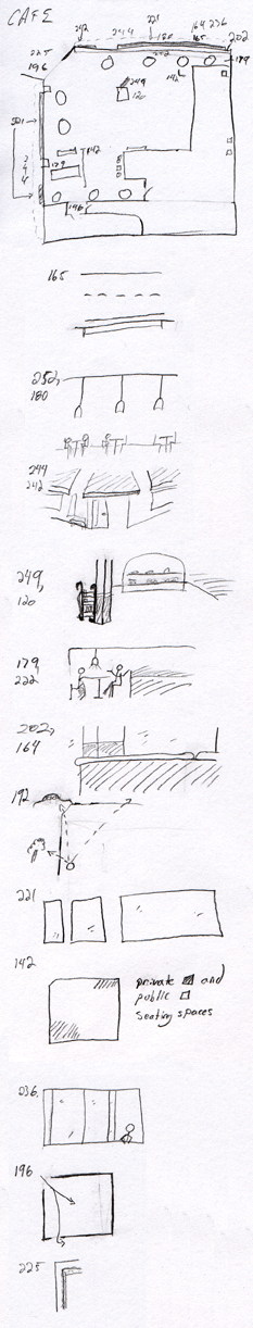 New pattern: Different tables People often want make use of cafes for study sessions, informal meetings or games. They need space to lay out paper projects or other materials. While an individual student can find a place to work nearly anywhere in a cafe, groups need special accomodations. I am a member of a research reading group that meets in a cafe every week to discuss papers and project progress. We have thus far met in two different locations -- Au Coquelet and Berkeley Espresso. In both cafes we were able to find two small tables to push together to form a working space, but it was nonetheless awkward. Starbucks provides a large table towards the back of the cafe, giving small groups a quieter place to spread out papers and work on projects. Also, it is especially helpful to have a bench on at least one side of the table to give people even more space to spread out their materials But some tables are valuable for game playing as well. At several restaurants and cafes, table-tops overlaid with game grids provide a surface for people to play chess or checkers while waiting for a seat or food. In other places it may be appropriate to simply provide a large table space in a secluded section of the cafe with game nearby, in a pouch on the wall, for example. Finally, groups might want to work under different levels of light. An overhead light may be useful if laying out papers or sketching ideas, but if people are working independently and communicating only seldomly, as in study groups, smaller more directed lights may be appropriate. Place small tables with game-board table tops in the waiting area of a cafe or restaurant and larger tables in more secluded areas. Put larger tables near built-in benches and provide adjustable lighting. Smaller, more mobile tables may be more appropriate in busier, more public areas (142) and may be good places to wait for other guests (150). Built-in seats may well complement larger tables (202). |